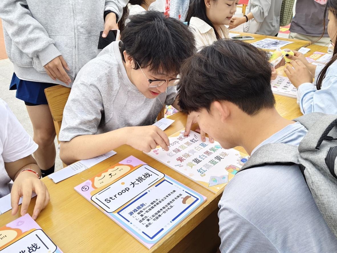 踏入现场,映入眼帘的是形状可爱的减压玩具和欢声笑语的游戏体验区。此次活动我们通过精心策划的“Stroop色彩字词挑战赛”和“智速大冒险”来帮助同学们缓解压力、增强心理健康意识。活动现场,同学们通过对色彩的判断提高自己的心理素质与判断力,同学们在游戏中展现自己的青春活力,于大冒险中收获心理调节技巧,在轻松互动中感受关爱自我、联结彼此的温暖。同学们纷纷表示认识到内耗对个人心理健康和成长的负面影响,在游戏中缓解了自己学习、生活以及各方面带来的压力,在未来生活中会以平和饱满的心态积极备考,以更加积极向上、乐观豁达的心态去拥抱未来的每一个挑战。
